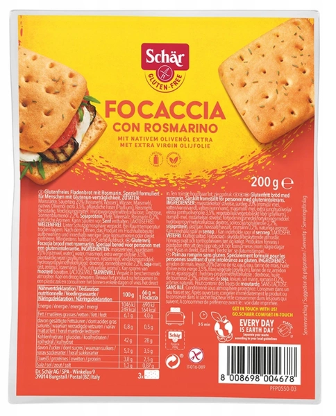 Nazwa oryginalna: Chleb bezglutenowy z rozmarynem, Focaccia con Rosmarino (3x66g) 200g Schar