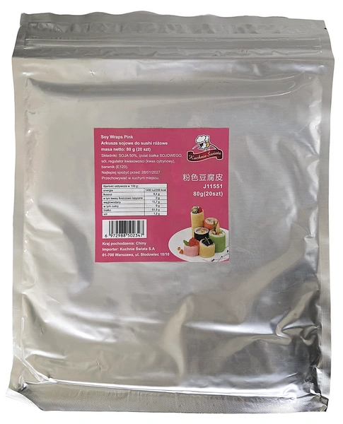 Sojowe arkusze idealnie sprawdzają się w przygotowaniu kolorowych rolek sushi, wrapów z warzywami, owocami czy tofu, a także jako delikatna otoczka do sałatek lub mini kanapek finger food. Można je również wykorzystać w daniach deserowych – do zawijania świeżych owoców, musu lub kremów. Ich atrakcyjny wygląd sprawia, że doskonale prezentują się na talerzu, czyniąc każde danie bardziej apetycznym i wyjątkowym.